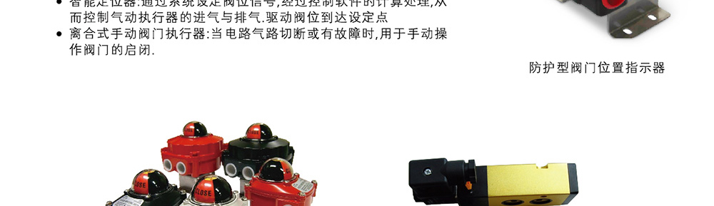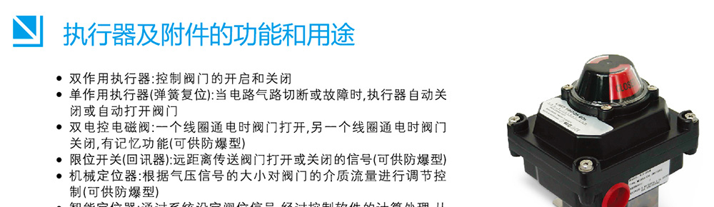 . 双作用执行器:控制阀门的开启和关闭 . 单作用执行器(弹簧复位):当电路气路切断或故障时,执行器自动关闭或自动打开阀门 . 双电控电磁阀:一个线圈通电时阀门打开。另一个线圈通电时阀门关闭,有记忆功能(可供防爆型) . 限位开关(回讯器):远距离传送阀门打开或关闭的信号(可供防爆型)
